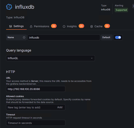 – Sélectionnez la source de données (InfluxDB ou Prometheus).