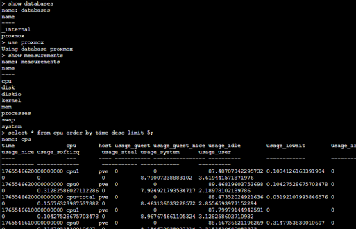 - Requête : SELECT mean(« used_percent ») FROM « disk » WHERE (« host » = ‘proxmox’)
