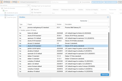 - LXC (conteneur) : léger, rapide à lancer, consomme peu de ressources. Mais il partage le noyau de l’hôte Proxmox.