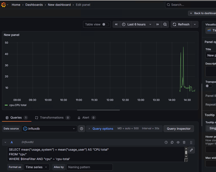 - Requête : SELECT mean(« usage_user ») FROM « cpu » WHERE (« host » = ‘proxmox’) GROUP BY time(1m)