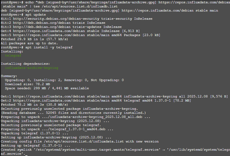 • Installez le paquet telegraf sur l’hôte Proxmox :